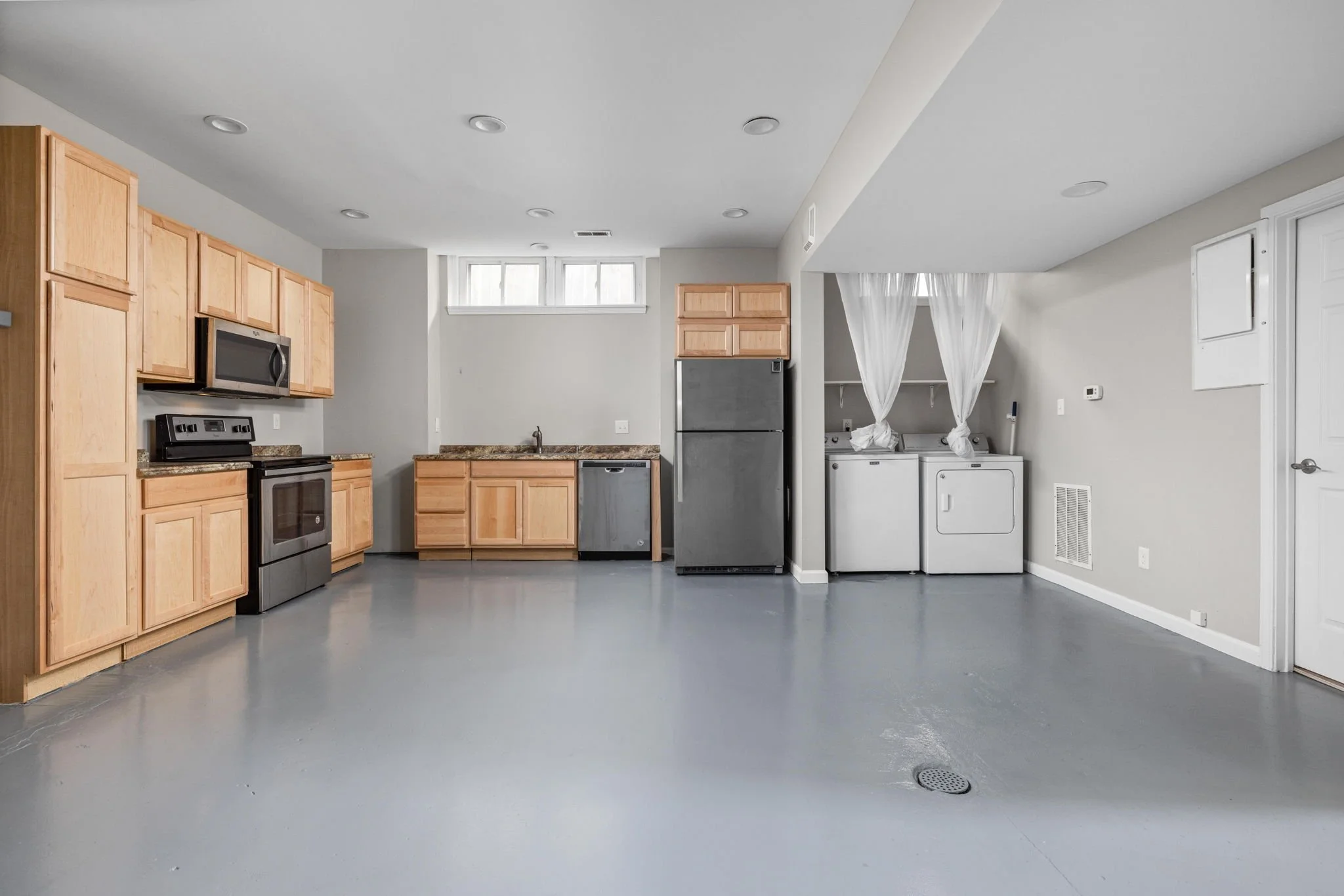 The basement functions as a separate apartment with 2 bedrooms, full bath, kitchen, and living room. Additionally, a carriage house apartment above the garage provides another income stream.